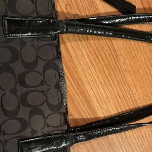 Stylish Coach tote with signature pattern. Black and gray design. Perfect for daily use. Straps have signs of wear and tear from folding over.