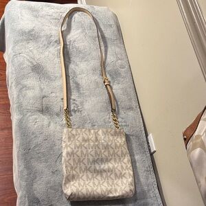 Michael Kors cream and tan signature logo crossbody bag with gold hardware. Perfect for everyday use.