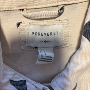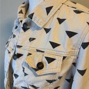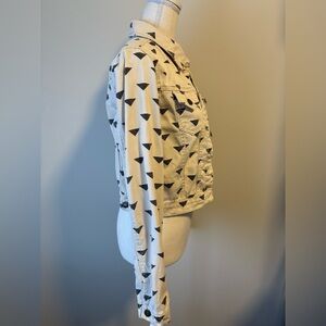 This classic Forever 21 cropped denim jacket features a unique black and beige geometric triangle print that gives it a cool, slightly retro, and edgy vibe.