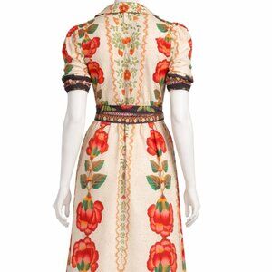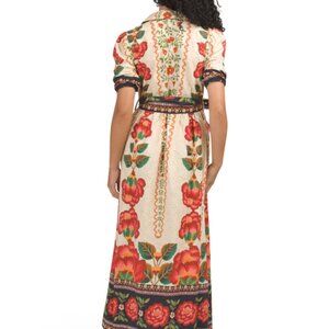 Beautiful Celina Moon maxi dress featuring a vibrant floral print in cream and red tones. This dress has short sleeves, a classic collar, and a half button-front design. Comes with a removable waist tie belt that creates a flattering silhouette. Lightweight cotton fabric makes it perfect for spring, summer, vacations, or casual outings.
