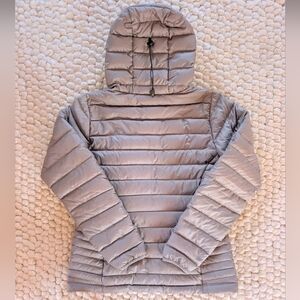 Patagonia Down "Sweater Hoody Jacket." Super warm, lightweight, and windproof; shell made from recycled materials, responsible down fill. Comfortable and packable! Selling for my sister who wore it two or three times.