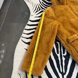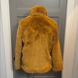 Warm and stylish faux fur jacket in a rich tan color. Features a plush texture and two front pockets. please note there is wear and tear cracking of FAUX leather trim around zipper area but very hard to notice it is on both sides is zipper. Functions perfectly in the coat is very warm.