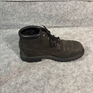 Timberland Nellie double waterproof chukka boots crafted from premium full-grain leather in a versatile black nubuck finish. These durable ankle boots feature a seam-sealed construction to keep feet dry, a padded collar for a comfortable fit around the ankle, and a rugged lug outsole for superior traction. The lace-up closure is accented with hexagonal metal eyelets and a signature brand logo charm at the base of the laces. Ideal for outdoor adventures or urban streetwear, these boots offer a timeless work-boot aesthetic with a lower profile.