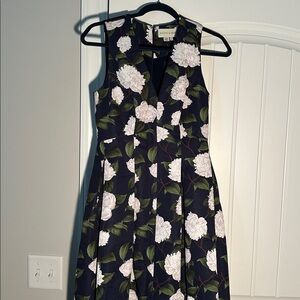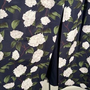 The Brooke is a V-neck gown with box pleats, peaked waist seam, and side pockets. This dress is considered to be a classic, essential silhouette, a perfect canvas for breathtaking prints. This one is featured in Navy Moonlit Garden, a peony print with gorgeous touches of green and ivory.
