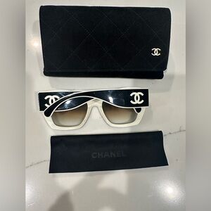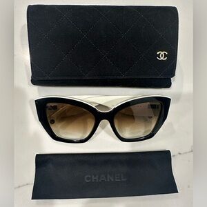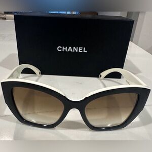 Stylish butterfly sunglasses with a bold black and white frame. Perfect for a fashionable look.