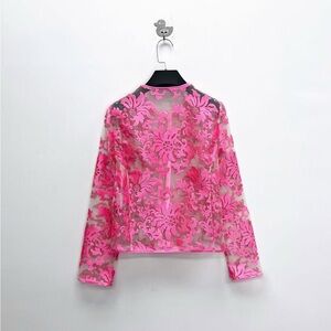 Chic pink sheer jacket with floral design. Perfect for stylish layering.