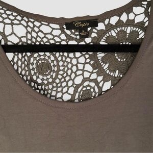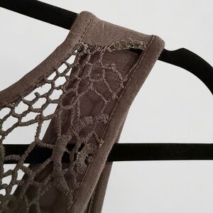 Flowy and feminine midi dress by Cupio in a soft olive green. Features a stunning crochet lace racerback and matching lace trim along the high-low hemline for effortless boho style. Easy to dress up or down. Measures about 52 inches from shoulder to lowest part of the hem.