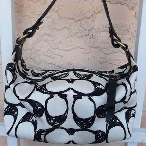 The Scribble Logo Hobo Bag is a White Silk w/ Black "C"s & a tiny stain near the brass logo hardware