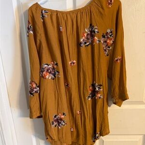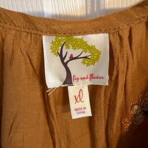 Anthropologie Fig & Flower Button Blouse Boho TOP Tunic Embroidered Floral Med Mustard blouse with floral embroidery. Features button-up front. Ideal for casual wear.
