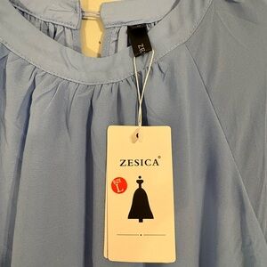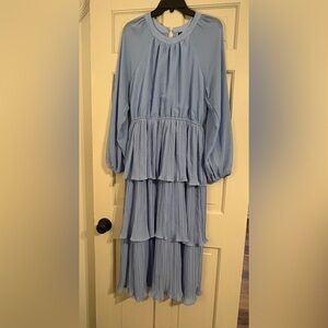 Powder blue, flowy, layered, chiffon dress. It gives soft, airy, romantic vibes. NWT size large