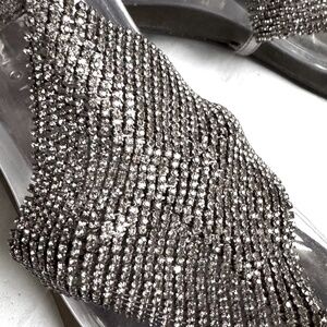 Stunning and elegant Lola Cruz flat sandals featuring a shimmering rhinestone mesh panel that drapes beautifully across the foot. Finished in a sleek metallic silver with a minimalist toe loop and adjustable ankle strap. A perfect statement flat for summer events, evenings out, or elevating any outfit with sparkle.