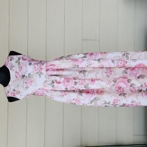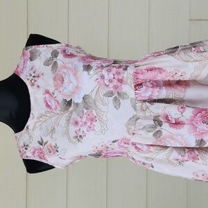 Features pink floral with green leaves & gold on off-white or cream brocade pattern, hidden back zip closure, high gathered waist, fully lined.