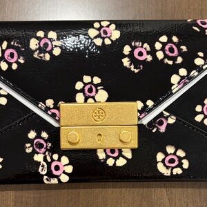 Chic Tory Burch clutch in Black Floral Stamp design. Features a beautiful gold clasp. Stylish and versatile.