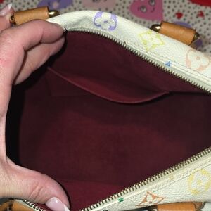Chic Louis Vuitton satchel with vibrant multicolor monogram. Features sturdy brown leather handles and gold-tone hardware. Perfect for adding flair to any outfit.