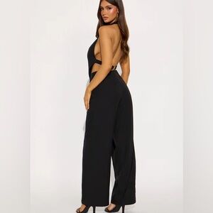 Elegant black halter jumpsuit with asymmetrical top. Wide Leg, open back. Lined. Minimal stretch. 32 inch inseam. Size: M NEW.