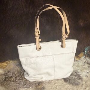 Stylish Michael Kors tote with a white body and tan handles. Ideal for everyday use.