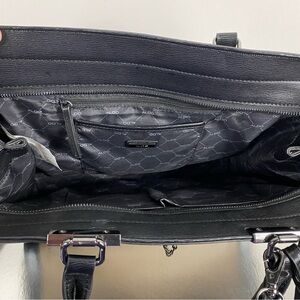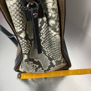 This Aldo tote bag showcases a chic black and tan color scheme with snakeskin accents, perfect for adding a touch of elegance to any outfit. Crafted with a structured silhouette, it features a versatile design with top handles and a detachable shoulder strap for easy carrying. The combination of textures and materials enhances its luxurious appeal, making it a standout accessory.