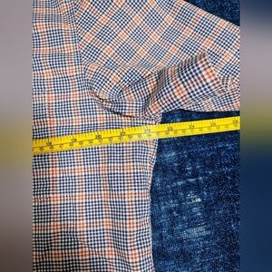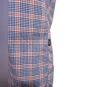 Boss by Hugo Boss men's short sleeve button up shirt, size large. Print is a really nice plaid check pattern in red white and blue. Flat lay measurements chest 22.5", length 28.5" 100% lightweight cotton, this is perfect for a hot day!