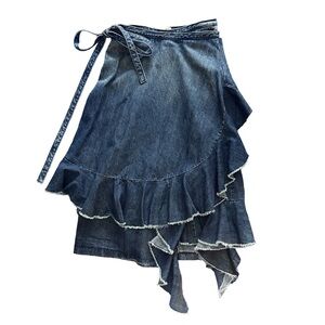 Chic denim midi skirt with layered ruffles. Asymmetrical hem adds flair. Ideal for versatile styling.