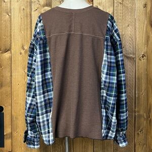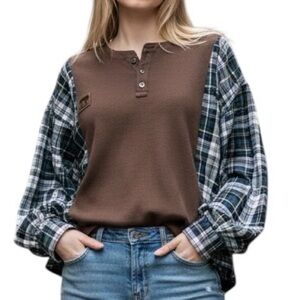 roundtree & yorke, waffle knit henley, plaid sleeve top, mixed media shirt, oversized fit, relaxed fit, outdoor style, outdoorsy, casual wear, loungewear, streetwear, cabin core, fall layering, cozy top, lifestyle apparel, everyday comfort, hiking inspired, rustic casual, workwear inspired