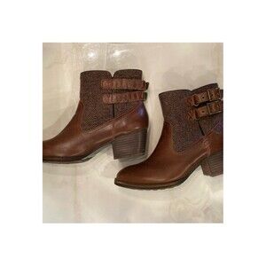 Cat Women’s Boots Brown Tweed Top with Buckles Size 8 WIDE Stacked Heel Booties