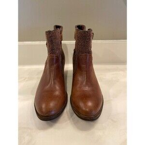 Cat Women’s Boots Brown Tweed Top Booties Buckles Size 8 WIDE Stacked Heel Shoes