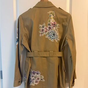 Crafted in a classic khaki cotton twill, this statement piece features beautifully applied floral patches throughout, structured flap pockets, shoulder epaulettes, and a flattering self-tie waist belt for a perfectly cinched silhouette. This jacket layers effortlessly over denim, dresses, or tailored trousers.