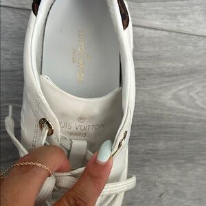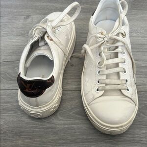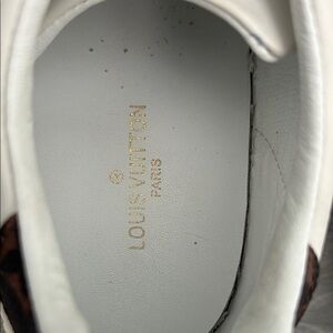 Elegant LV white sneakers with classic monogram accents. Ideal for everyday style. Made in Italy! Genuine leather. size 37 1/2-38 Heavy for sneakers. Very good quality shoes. Does not have a serial number as I purchased them this way. May have rubbed off. Comes from a pet free smoke free home. Please make an offer!