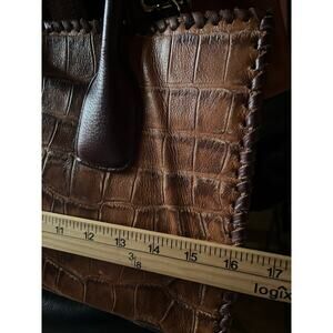 Elevate your style with the Juan Antonio Hornback Caramel Leather Tote. Crafted from croco embossed leather, this timeless design effortlessly takes you from day to night. The hand-tooled details, whipstitch accents, and smooth dark brown leather handle create a stunning western accessory. With the perfect strap length, it's versatile for over the shoulder or carry. Due to lighting used during photography, actual finishes may vary from imagery