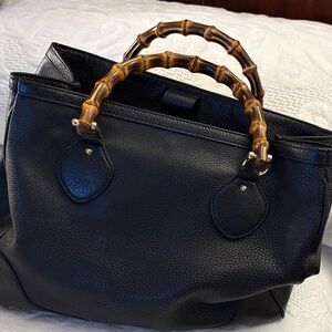 Elegant Black Leather Tote with Bamboo Handles