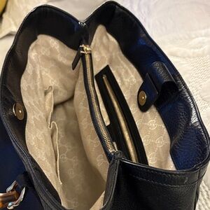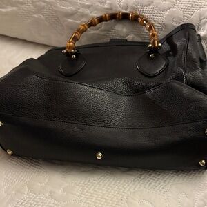 This sophisticated black leather tote features unique bamboo handles, offering a stylish and eco-friendly touch. Perfect for any occasion, this bag combines elegance with practicality.