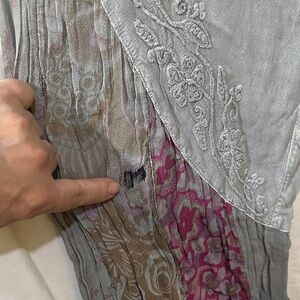 Embrace a bohemian vibe with these stylish wide leg pants. Featuring a unique patchwork design in gray and multicolor accents, these pants are perfect for a casual day out. The comfortable fit and artistic flair make them a must-have addition to your wardrobe. Bought them to reposh-hole was in the pant when I purchased. Sorry for wrinkles, been in a bag.