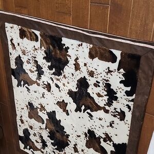 Stylish cow print area rug with a soft texture. Features a mix of black and brown on a white background.