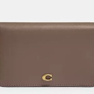 Elegant brown leather drawstring bag with gold accents. Perfect for any occasion.