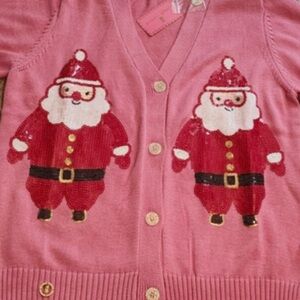 Celebrate the season with this charming pink sweater featuring the jolly big man - Santa himself!. Perfect for adding a touch of festive cheer to your wardrobe. Simply Southern- Sparkly Sequin Pink Cardigan Sweater with Santa Claus! -Size Large great for christmas dinner or a theme party - who wants to be tacky at the sweaty party when you can sparkle and shine? Were you naughty or nice this year?! Size Extra Large XL