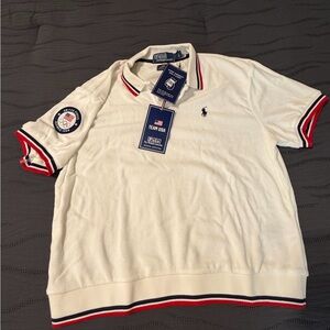 Classic Ralph Lauren polo. Cream color with navy logo. Red and navy collar accents. Perfect for casual wear.