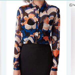Vibrant blouse with abstract patterns. Features a button-up front. Long sleeves for a chic look.