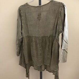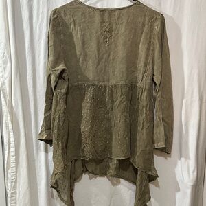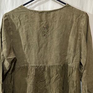 This elegant olive top features intricate embroidery, perfect for adding a touch of sophistication to your wardrobe. Ideal for casual or semi-formal occasions.