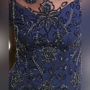 This Long Beaded Mesh Mermaid Gown Features An Illusion Elbow Sleeve Bodice.