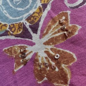 Sequins around flowers at base of skirt.