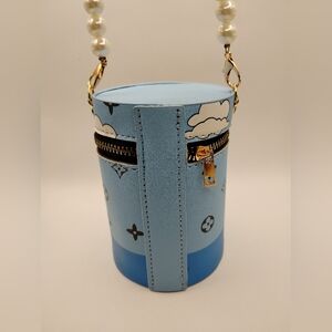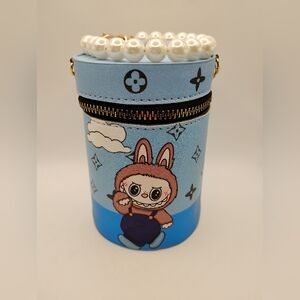 Charming blue cylinder leather cosmetic bag featuring a Labubu character design. Perfect for organizing your beauty essentials with style. The pearl strap is removable. This is a good size and can hold a good amount of cosmetic items or anything you would like to carry. This is Brand new without tags. No callouts