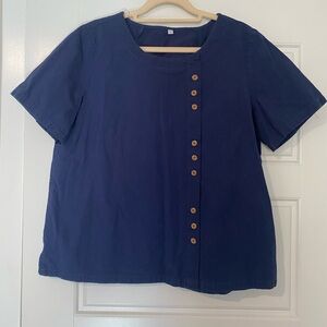 Elevate your wardrobe with this stylish navy button-down top. Perfect for any occasion, this top offers both comfort and elegance.