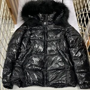 Stay warm and stylish with this sleek black puffer jacket. Featuring a luxurious faux fur hood, it's perfect for cold weather. Ideal for any winter wardrobe.