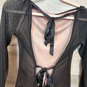 Elevate your night-out look with this stunning sheer bodysuit from Urban Outfitters' Out From Under line. Features a delicate polka dot mesh overlay and a dramatic, deep open back with two satin tie closures for a customizable fit.