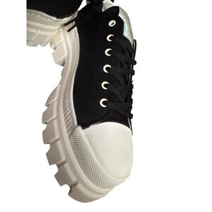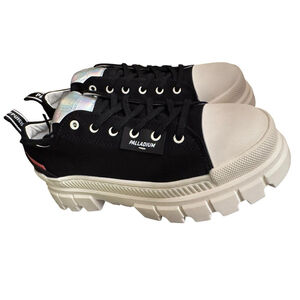 The Palladium Revolt Lo TX -10 sneakers are a versatile and stylish option for women looking for comfort and breathability in their shoes. With a lace-up closure, round toe shape, and low-top shoe shaft style, these sneakers are perfect for various occasions such as travel, activewear, casual outings, and workwear. The black and white solid color palette with fabric upper and lining material gives these sneakers a modern and sleek look. The rubber outsole and block heel style provide durability and support, making them suitable for walking and everyday activities. Perfect for all seasons, these Palladium sneakers are a fashionable choice for the contemporary woman. Black/White size 10 in box. No defects.