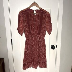 Anthropologie Floreat Amber Ruffle Dress in Wine Red Super cute dress from Anthropologie in size 6. Lined, with semi sheer panels on the sleeves with cut out in the back, buttons closured at the end of the sleeves. In excellent used condition holiday Christmas
