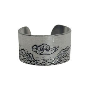 Handmade stamped mama otter ocean design silver tone adjustable wide cuff ring