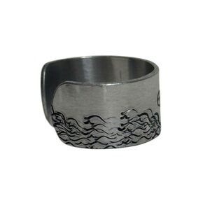 Elegant silver cuff ring featuring a stamped design. Perfect for adding a touch of sophistication to any outfit.