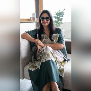 Satin, flowy, 3/4 sleeves, green with floral print. Perfect for a casual summer outfit or a beach cover up.