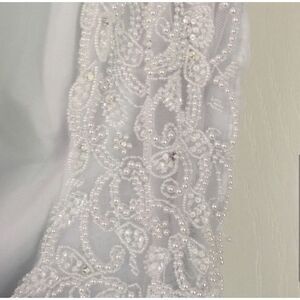 This dress is brand new, never worn, with tags still attached. It has beautiful beaded detailing and tool going down the train. The tag has a model to demonstrate how the dress will look on.
